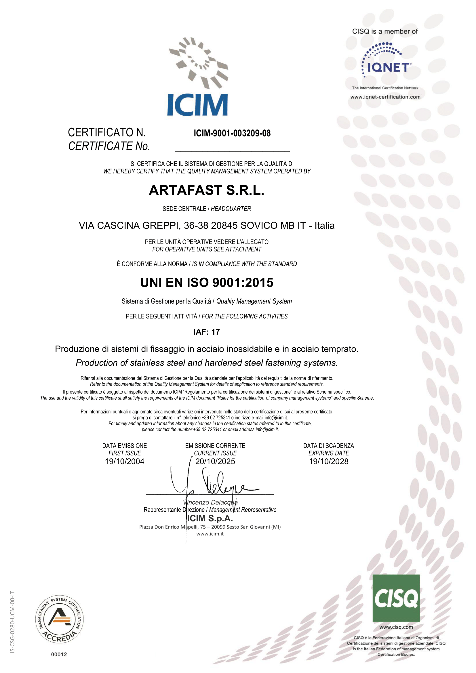 UNI EN ISO 9001 certified company in Sovico